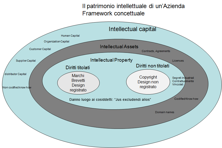 Nel grafico di cui sopra, i "beni immateriali" dotati di autonomia iniziano dal secondo insieme. Nel centro del framework, sotto forma di solido cubo, troviamo marchi e brevetti e design.